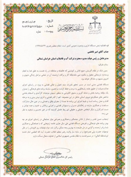 • تقدیر رئیس‌کل دادگستری خراسان شمالی از مدیرعامل شرکت آب و فاضلاب استان