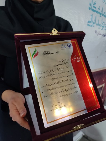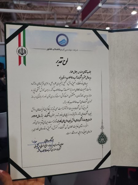 لوح تقدیر دوم نیز از سوی ستاد برگزاری نمایشگاه و به امضای مدیرکل سیاستگذاری، برنامهریزی و توسعه فناوری وزارت صنعت، معدن و تجارت اعطا شد که در آن از اجرای مناسب، مدیریت اثربخش غرفه و مشارکت فعال شرکت آب و فاضلاب استان یزد در معرفی توانمندیهای پژوهشی، فناورانه و همکاری با شرکتهای دانشبنیان و بخش خصوصی قدردانی شده است.