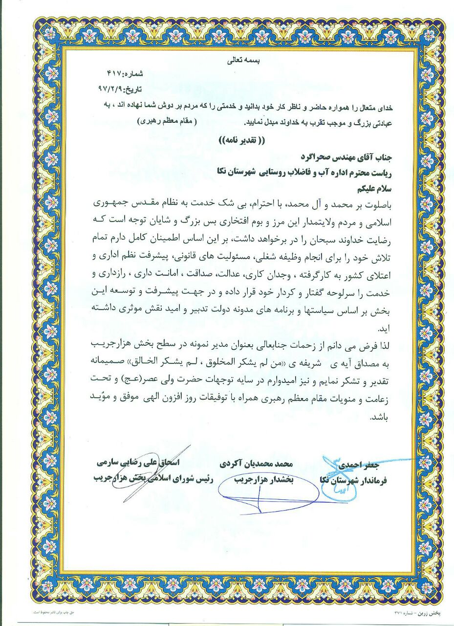 لذا فرض می دانیم از زحمات جنابعلی به عنوان مدیر نمونه در سطح بخش هزارجریب به مصداق  آیه شریفه «من لم یشکر المخلوق لم یشکر الخالق» صمیمانه تقدیر و تشکر نماییم ، امیدواریم در سایه توجهات حضرت ولی عصر(عج) و تحت زعامت و منویات مقام معظم رهبری همراه با توفیقات روز افزون الهی موفق و موید باشید.