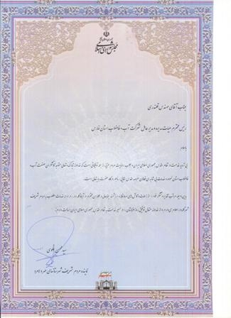 نمابنده مردم شهرستان های مهر و لامرد در مجلس شورای اسلامی با ارسال لوح تقدیر از مدیر عامل شرکت آبفا استان فارس به پاس زحمات وی در ارائه ی خدمات مطلوب آبرسانی به مردم شهرگله دار تقدیر کرد.