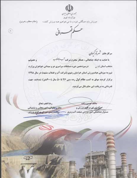 تیم خواهران صنعت آب و برق استان فارس در سيزدهمين دوره ی مسابقات سراسری آمادگی‌ جسمانی و دو و ميداني خواهران وزارت نیرو در بخش دو و میدانی قهرمان شد.