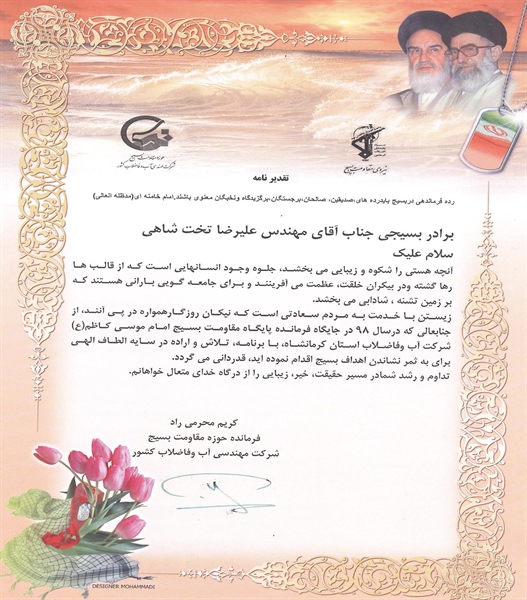 مهندس علیرضا تخت شاهی مدیرعامل آبفای استان کرمانشاه و فرمانده پایگاه مقاومت بسیج امام موسی کاظم(ع) شرکت آب و فاضلاب استان در چهارمین دوره از همایش بصیر که با حضور کلیه فرماندهان بسیج صنعت آب و فاضلاب شهری و روستایی کشور در استان خوزستان برگزار گردید، به عنوان فرمانده ارشد برتر معرفی و مورد تجلیل قرار گرفت.