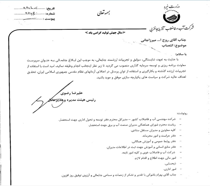 با عنایت به تعهد، شایستگی، سوابق و تجارب ارزشمند جنابعالی، به موجب این ابلاغ جنابعالی را به عنوان سرپرست معاونت برنامه ریزی و توسعه سرمایه گذاری منصوب میگردید تا زیر نظر اینجانب انجام وظیفه نمائید، امید است با استفاده از تجربیات ارزشمند گذشته و بکارگیری و استفاده از توان پرسنل در اعتلای آرمانهای نظام مقدس جمهوری اسلامی ایران، تحقق اهداف عالیه شرکت و سیاسیت های یکپارچه سازی موفق و موید باشید.