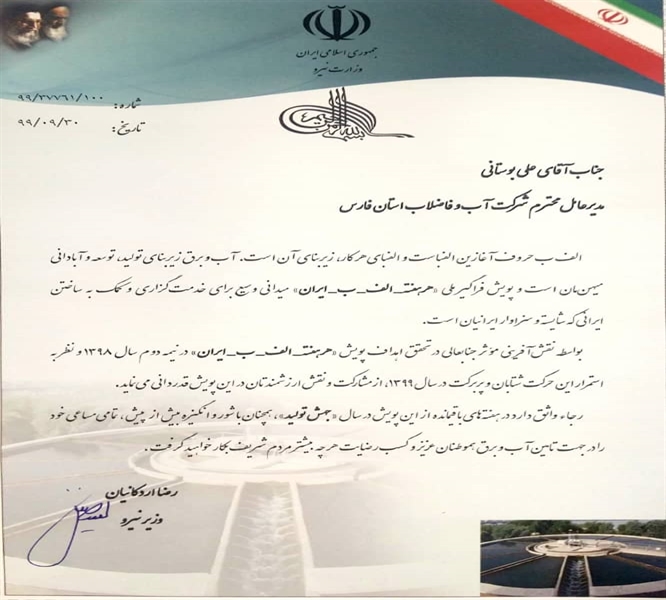 وزیر نیروی جمهوری اسلامی ایران با ارسال لوح تقدیر و تندیس یادبود از نقش موثر مدیر عامل شرکت آبفا استان فارس در تحقق پویش " هر هفته _ الف_ ب_ ایران" تقدیر کرد