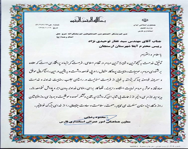 تقدیر معاون هماهنگی امور عمرانی استاندار فارس از مدیر امور آبفا شهرستان ارسنجان
