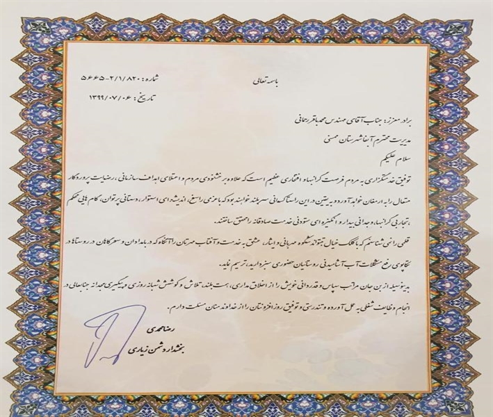 به گزارش روابط عمومی شرکت آبفا استان فارس، رضا محمدی بخشدار بخش دشمن زیاری شهرستان ممسنی با ارسال لوح تقدیر از محمد باقر رحمانی سرپرست امورآبفا شهرستان ممسنی به پاس آنچه اخلاق مداری ، همت بلند تلاش و کوشش شبانه روزی و پیگیری مجدانه در انجام وظایف، عنوان شده است ، قدردانی نمود .