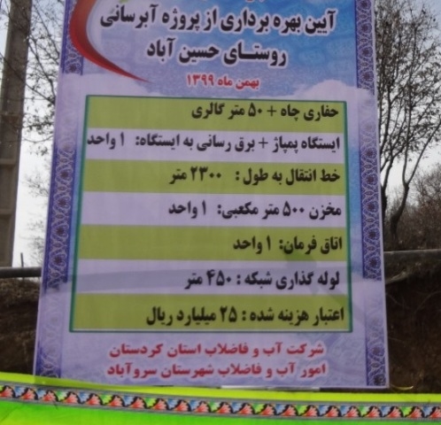 • پروژه آبرسانی به روستای حسین آباد شهرستان سروآباد با هزینه 25 میلیارد ریال به بهره برداری رسید