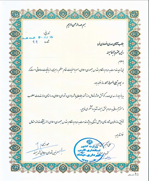 بنابراین گزارش در بخشی از این لوح سپاس آمده است: بدینوسیله از سعه ی صدر ، کوشش موثر و تعامل ارزشمند جنابعالی با شهرداری و شورای اسلامی، در راستای ارائه ی خدمات مطلوب و مستمر آبرسانی به مردم بخش میمند تقدیر و تشکر می نماییم.
