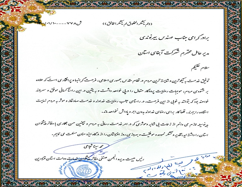 تقدیر انجمن صنفی دفاتر پیشخوان دولت از شرکت آب و فاضلاب استان قزوین