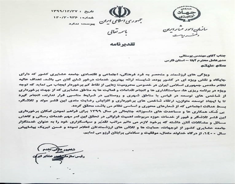 بنا بر این گزارش در بخشی از این نامه آمده است: بی شک همکاری ها و مساعدت های دلسوزانه ی جنابعالی در سال 1399 برای فراهم نمودن امکان برخورداری این قشر تلاشگر و غیور از خدمات حوزه ی مربوطه ، اهمیت فراوانی در تحقق این امر مهم خدمات رسانی و کاهش مسائل و مشکلات آنان داشته که بر خود لازم می دانم مراتب تقدیر و سپاسگذاری خود را به عنوان خدمتگذار جامعه ی عشایری کشور از توجهات ، حمایت ها و تلاش های ارزشمندتان اعلام نمایم.