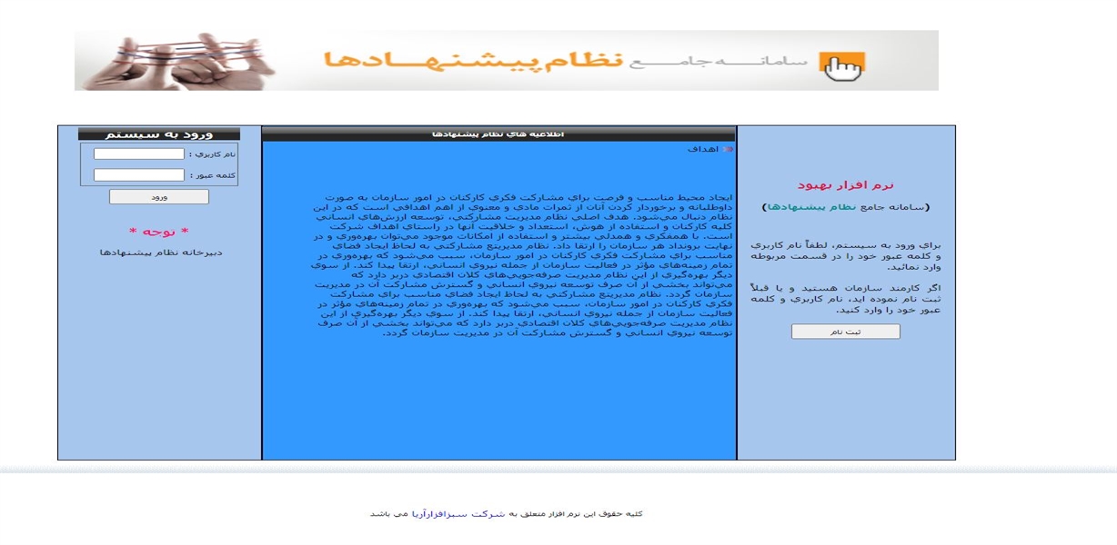 به گزارش روابط عمومی آبفای استان همدان، الهام شهبازی با اشاره به اینکه، سامانه جامع نظام پیشنهادات با عنایت به تاکیدات مدیرعامل شرکت و همچنین بر مبنای اهمیت دریافت نظرات سازنده همکاران درسایت شرکت آب و فاضلاب استان راه اندازی و دردسترس کارکنان و هم استانی های عزیز قرار گرفت، گفت:برهمین اساس شرکت کنندگان پس از ورود به سامانه و ساخت نام کاربری میتوانند پیشنهادات خود را ثبت نمایند.