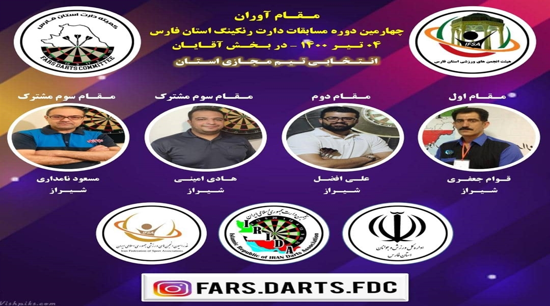 دارت اندازان شرکت آبفا استان فارس در چهارمین دوره از مسابقات انتخابی دارت مجازی استان فارس ، ضمن کسب دو عنوان قهرمانی مسابقات ، دو سکوی قهرمانی مسابقات را از آن خود کردند.
