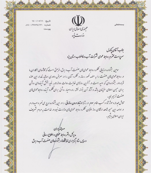 تلاش مجدانه و موثر شما و کسب مقام سوم در رشته ارتباطات درون سازمانی را در این جشنواره ارج می نهم و امیدوارم در ادامه این مسیر شاهد ارتقای روز افزون عملکرد روابط عمومی های وزارت نیرو در خدمت به مردم شریف ایران اسلامی باشیم .