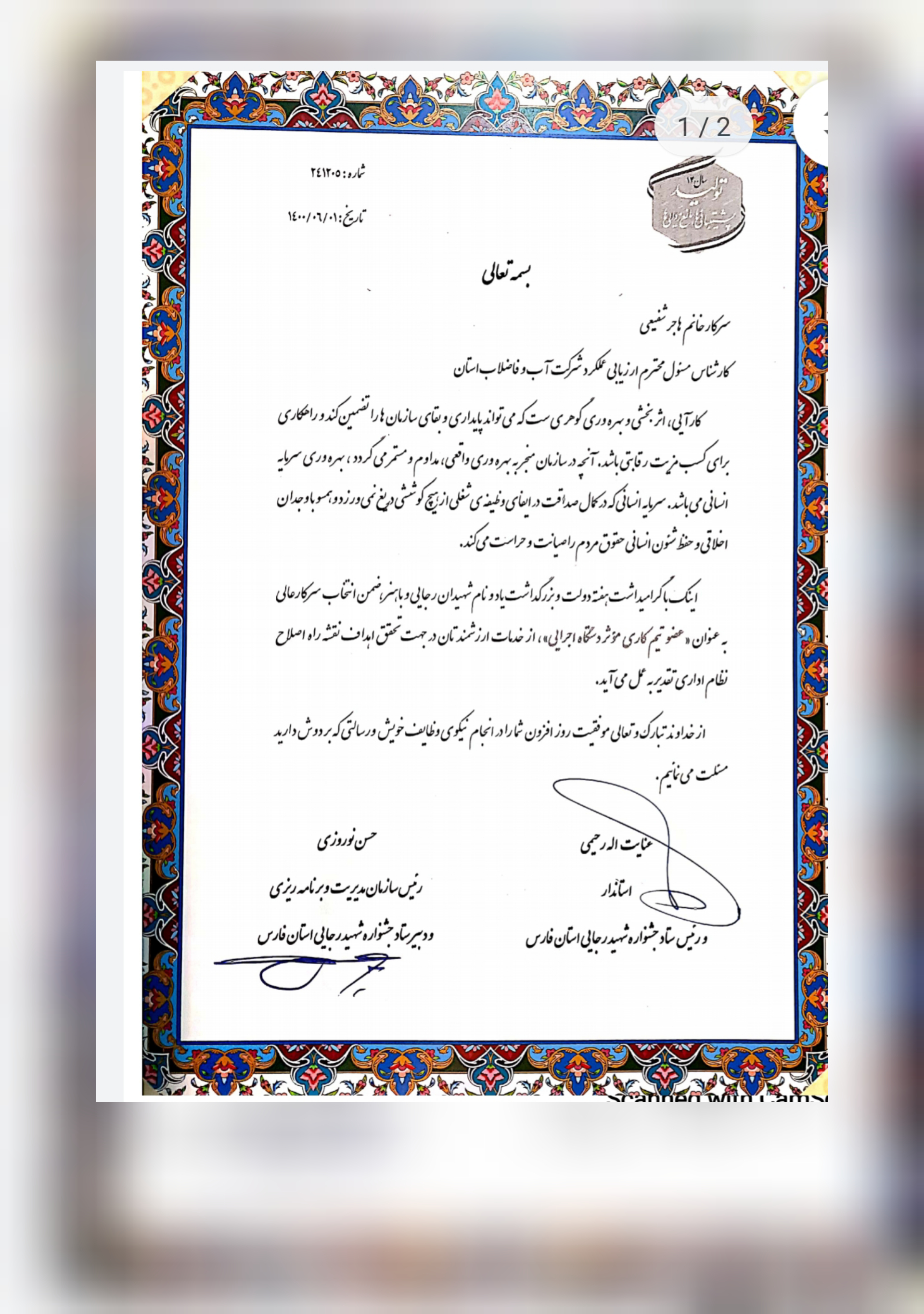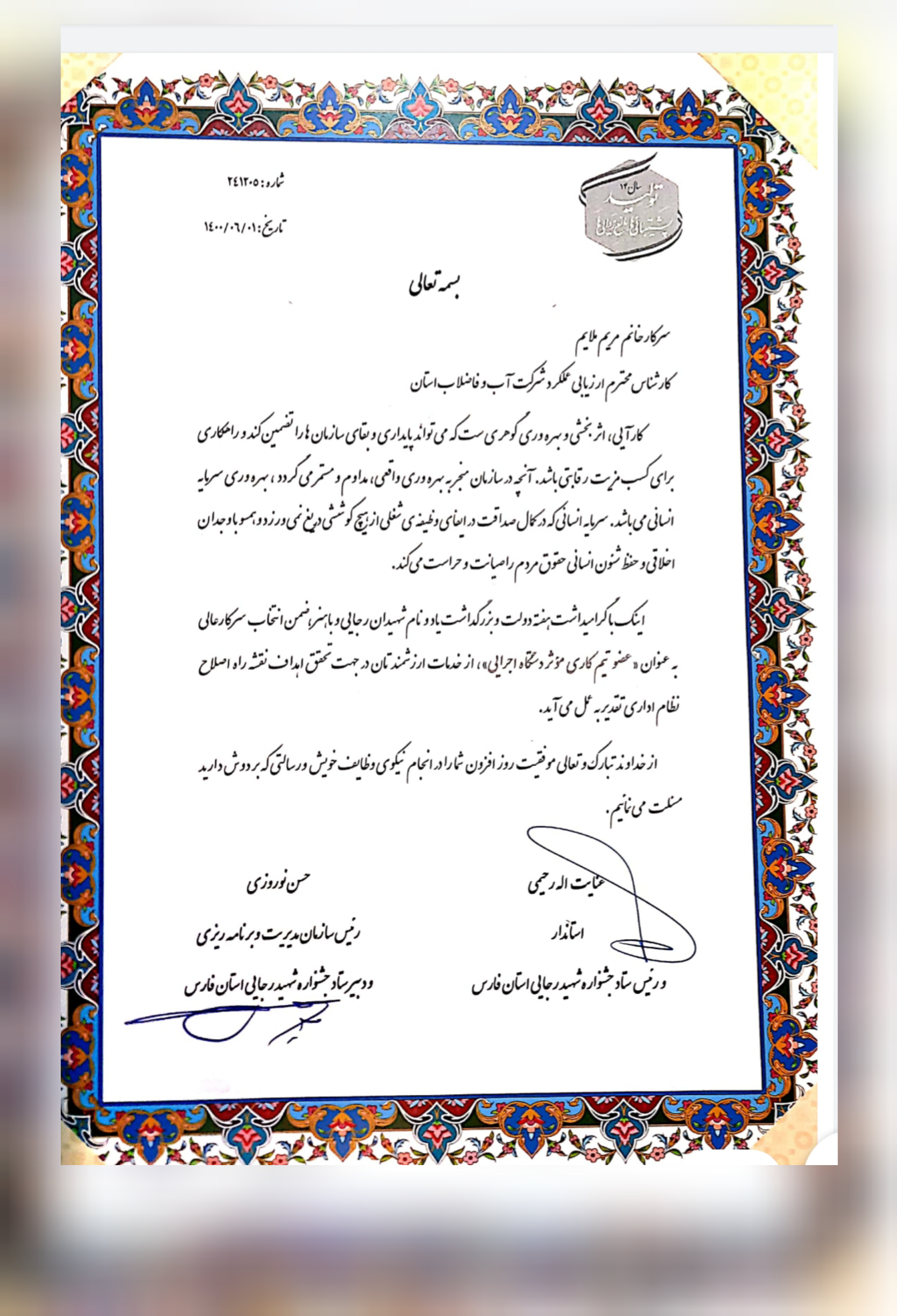 گفتنی است مریم ملایم و هاجر شفیعی دو تن از کارشناسان ارزیابی عملکرد شرکت آبفا فارس نیز ضمن انتخاب به عنوان عضو تیم کاری مؤثر دستگاه های اجرایی استان فارس، طی لوح های تقدیر مشترک از سوی ر ئیس و دبیر ستاد جشنواره شهید رجایی استان فارس به صورت جداگانه مورد قدردانی قرار گرفتند.