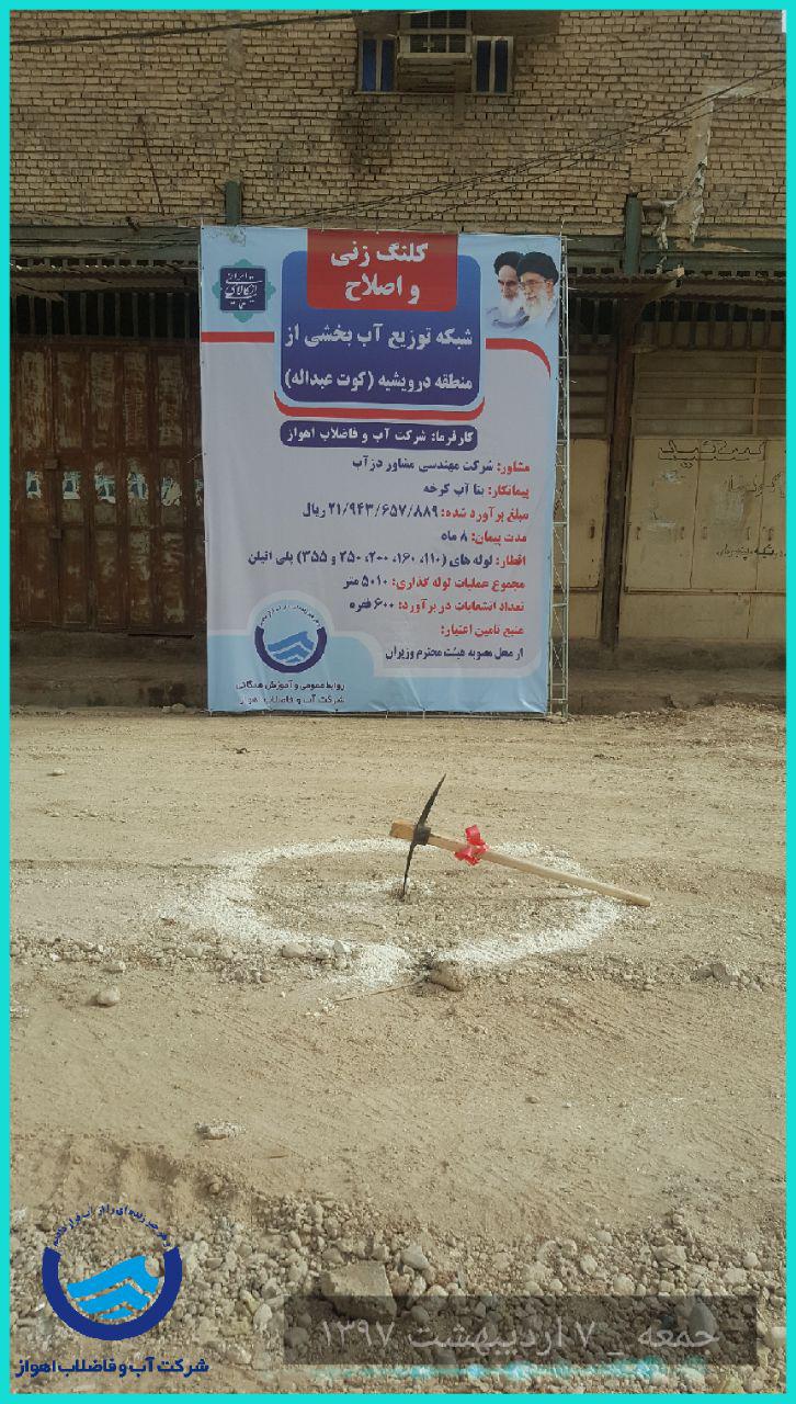 آیین کلنگ زنی پروژه اصلاح شبکه آب توزیع  بخشی از منطقه درویشه (کوت عبداله) و حمیدیه با حضور دکتر شریعتی استاندار خوزستان، فردوس کریمی مدیرعامل شرکت آب و فاضلاب اهواز ، جوادکاظم نسب الباجی نماینده مردم اهواز ، کارون ، باوی و حمیدیه در مجلس شورای اسلامی ، پیمان کاظمی نژاد دستیار استاندار در امور عمرانی ، سعید رضوانی مدیرکل روابط عمومی و امور بین الملل استانداری خوزستان، فرمانداران شهرستان های کارون و حمیدیه برگزار شد.