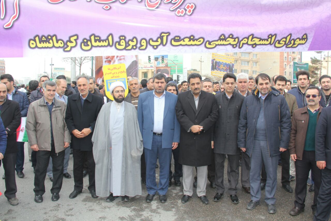 به گزارش روابط عمومی شرکت آب و فاضلاب استان کرمانشاه، مهندس علیرضا تخت شاهی رئیس شورای انسجام بخشی صنعت آب و برق استان کرمانشاه و مدیرعامل شرکت آبفای استان به اتفاق کارکنان این شرکت درکنار دیگر ادارات زیرمجموعه وزارت نیرو و صنعت آب و برق در استان، همانند سایر ارگانها، نهادها و اقشار مختلف مردم استان با حضور پرشور خود در راهپیمایی 22 بهمن ماه، بار دیگر با آرمانها و ارزشهای نظام مقدس جمهوری اسلامی ایران تجدید پیمان کردند.