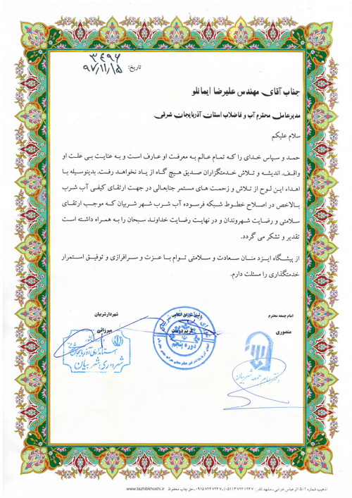 حجت الاسلام منصوری امام جمعه ، میرزایی شهردار و کریم دوست رئیس شورای اسلامی شهر شربیان با ارسال لوح سپاس به مدیر عامل شرکت آب و فاضلاب استان آذربایجان شرقی از تلاش های بی دریغ مهندس ایمانلو در خصوص ارتقائ کیفیت آب شرب و همچنین اصلاح خطوط شبکه فرسوده آب شرب شهر شربیان که در نهایت موجب ارتقاء سلامتی شهروندان شده است ، تشکر و قدردانی نمودند .