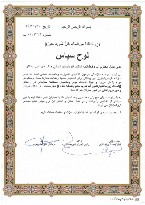 محمودی فرماندار هریس ، حجت الاسلام غفاری ثانی امام جمعه بخشایش ، و فراهانی رئیس شورای اسلامی شهربخشایش با ارسال لوح سپاس به مدیر عامل شرکت آب و فاضلاب استان آذربایجان شرقی از تلاش های بی دریغ مهندس ایمانلو در خصوص " احداث زیر ساخت ها و تامین آب شرب سالم و تصفیه شده " شهر بخشایش که در نهایت موجب ارتقاء سلامتی شهروندان شده است ، تشکر و قدردانی نمودند .