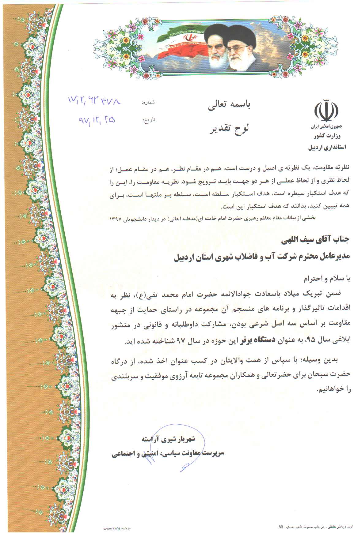 در ارزیابی استانداری اردبیل از عملکرد دستگاههای اجرایی استان در حمایت از جبهه مقاومت،شرکت آب و فاضلاب شهری استان اردبیل به عنوان دستگاه برتر استانی انتخاب شد.