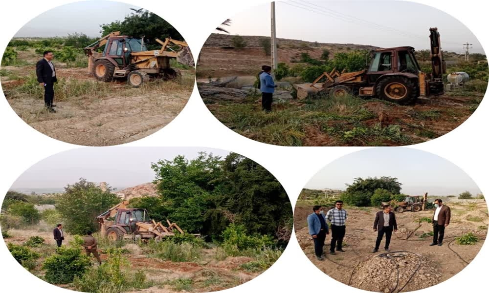 • تخریب و آزاد سازی اراضی باغات غیر مجاز در حریم چاه های آهکی شماره۴و۵ جنت شهر شهرستان داراب