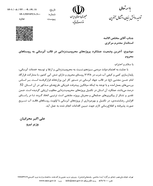 وزیر نیرو در این نامه، میانگین پیشرفت فیزیکی پروژههای جهاد آبرسانی را در استان مرکزی را 52 درصد اعلام کرد، این در حالی است که فقط یک سوم مدت زمان اجرای پروژهها، سپری شده است.