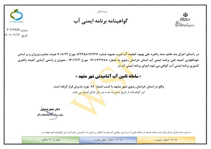 مدیرعامل شرکت آب و فاضلاب مشهد از دریافت گواهینامه برنامه ایمنی آب شهر مشهد توسط این شرکت از سوی وزارت بهداشت، درمان و آموزش پزشکی خبر داد.