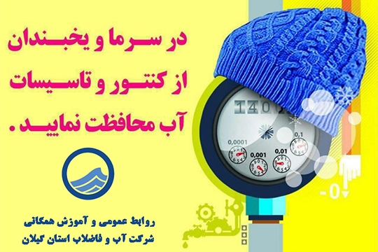 در صورت مشاهده یخ‌زدگی از حرارت‌دادن مستقیم و یا ریختن آب جوش روی کنتور و یا لوله‌های آب داخل ساختمان و یا از برافروختن آتش در مجاورت شیرها و لوله‌های آب جدا خودداری شود.️