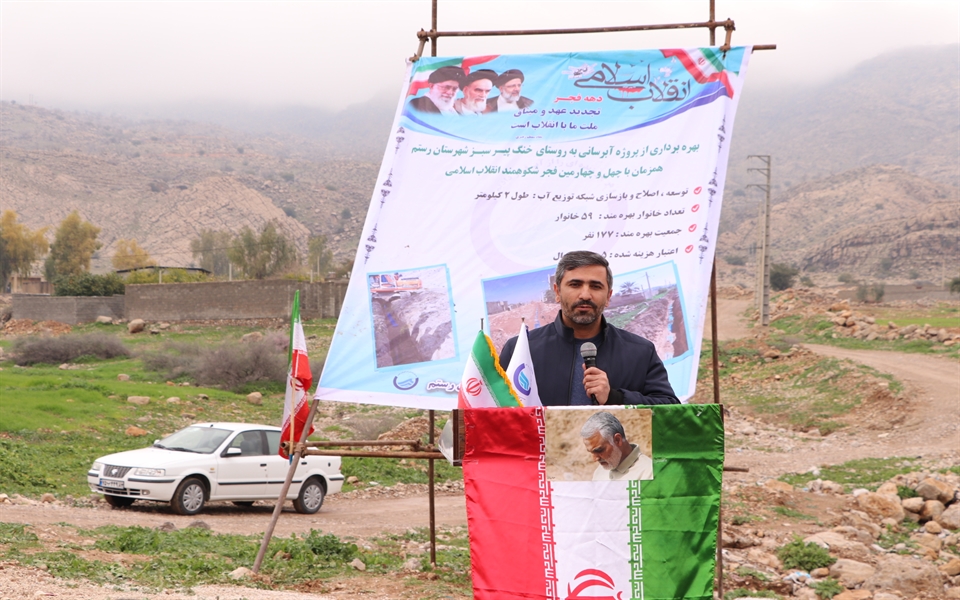 در این مراسم وحید حق شناس معاون بهره برداری و توسعه ی آب شرکت آبفا استان فارس نیز طی سخنانی ضمن تبریک به مناسبت ایام دهه ی پر فروغ فجر انقلاب اسلامی و چهل چهارمین سالگرد پیروزی انقلاب مردم ایران، اظهار داشت: به میمنت فرارسیدن این ایام فرخنده، پروژه ی اصلاح و توسعه ی 2000 متر از شبکه ی توزیع روستای خنگ پیر سبز شهرستان رستم(فارس) با صرف اعتباری بالغ بر 5 میلیارد ریال در مدار بهره برداری قرار می دهد که 59 خانوار این روستا از مزایای آن منتفع می گردند.