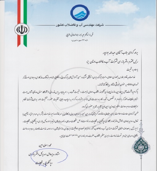 ضمن آرزوی سعادت وسلامت برای جنابعالی وخانواده گرامیتان در زمینه خدمت بیشتر به مردم عزیز همچنین با تعامل روحیه جهادی وتلاش وافر خود در همکاری وپاسخگویی به شکایات در خواست ها وحل مشکل مردمی وماموریت های مرتبط با اداره کل بازرسی وپاسخگویی به شکایات،زمینه نیل به اهداف متعالی شرکت مهندسی آب وفاضلاب کشور را فراهم نموده اید،موفقیت وبهروزی روز افزونتان را درادامه خدمت خالصانه به مردم در دولت انقلابی ومردمی سیزدم تحت زعامت رهبری معظم انقلاب حضرت امام خامنه ای(مدظله العالی) مسئلت مینمایم.