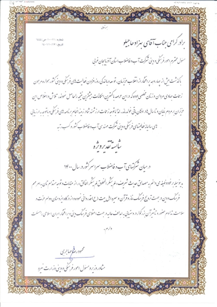 دفتر امور فرهنگی و دینی آب و فاضلاب استان آذربایجان غربی در ارزیابی عملکرد سال ١۴٠٠، در میان شرکت‌های آب و فاضلاب سراسر کشور رتبه ((شایسته تقدیر ویژه)) را کسب نمود.