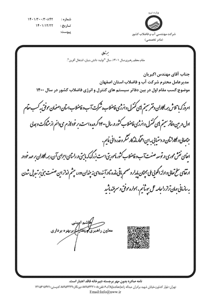 در همین خصوص معاون راهبری و نظارت بر بهره برداری آبفای کشور با ارسال لوحی از مدیر عامل آبفای استان اصفهان به لحاظ کسب این موفقیت تقدیر به عمل آورد.