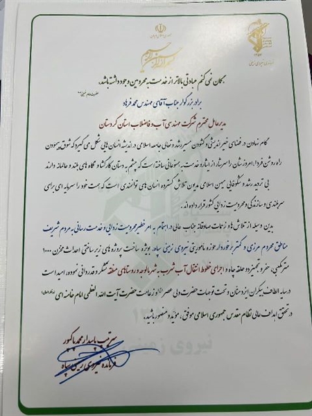 بدینوسیله از تلاشها و زحمات صادقانه جنابعالی در اهتمام به امر خطیر محرومیت زدایی و خدمت رسانی به مردم شریف مناطق محروم مرزی و کمتر برخوردار حوزه ماموریتی نیروی زمینی سپاه، بویژه ساخت پروژه های زیرساختی احداث مخزن یکهزار مترمکعبی، حفر و تجهیز 2 حلقه چاه و اجرای خطوط انتقال آب شرب به شهر مالوجه و روستاهای منطقه تشکر و قدردانی نموده، امید است در سایه الطاف بیکران ایزد منان و تحت توجهات حضرت ولی عصر و زعامت حضرت آیت الله خامنه ای در تحقق اهداف عالی نظام مقدس جمهوری اسلامی، موفق، مؤید و منصور باشید.