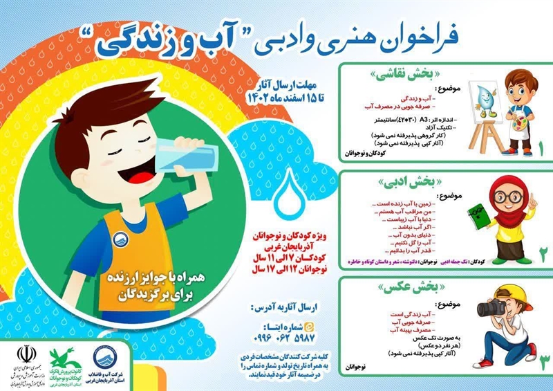محمداشرفی با بیان اینکه این جشنواره در دو رده سنی کودکان 7 تا 11 سال و نوجوانان 12 تا 17 سال برگزار خواهد شد، اظهار داشت: جشنواره هنری و ادبی«آب و زندگی» در سه بخش نقاشی، ادبی و عکس در خصوص آب و نقش آن در زندگی انسان ها و صرفه جویی و مدیریت مصرف آب با مشارکت ادارات کل آموزش و پرورش و کانون پرورش فکری کودکان و نوجوانان استان برگزار می شود.