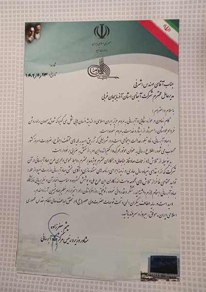 بدینوسیله از تلاش ها و زحمات صادقانه جنابعالی و همکاران محترم بویژه مدیر محترم روابط عمومی و مجری طرح های جهاد آبرسانی در آن شرکت که از ابتدای تیر ماه سال‌جاری در زمینه اجرای برنامه های مستندسازی و آگاهی بخشی جهاد آبرسانی وزارت نیرو از جمله تولید محتوای فاخر از تلاش های مجموعه دست اندرکاران این طرح ملی و پوشش گسترده و مناسب اخبار آن و نیز برپایی نمایشگاه جهاد آبرسانی اهتمام لازم داشته اید، تشکر و قدردانی نموده ، توفیق روز افزونتان را در استمرار امر خطیر جهاد تبیین آرزومندم.