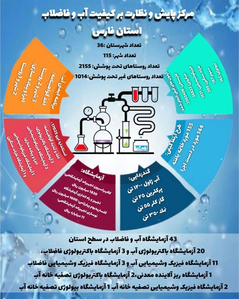این مقام ارشد حوزه آب و فاضلاب استان فارس افزود: شرکت آبفا استان فارس دارای 43 آزمایشگاه مجهز باکتریولوژی، فیزیکوشیمیایی، ریز آلاینده ی معدنی و بیولوژی آب و فاضلاب در سطح استان می باشد که از این تعداد 37 آزمایشگاه در حوزه آب و 6 آزمایشگاه نیز در بخش فاضلاب فعال است.