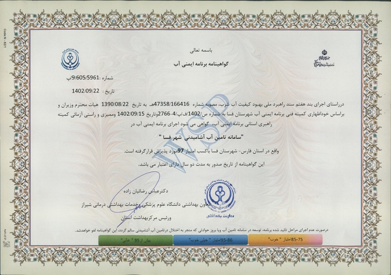 مدیر عامل شرکت آبفا فارس اضافه کرد: در شهرهای اقلید، استهبان و روستای جوی سفید شهرستان بوانات نیز اجرای این برنامه(Water Safety Plan ) انجام شده که پس از دو مرحله ممیزی در شرف اخذ گواهینامه ایمنی آب می باشند؛ همچنین در سال 1403 اجرا و پیاده سازی این برنامه در شهر ارسنجان و روستای دهنو شهرستان خنج آغاز شده است.