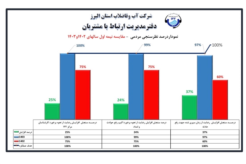 نامداری در خاتمه تصریح کرد: پیرو ارتباط مستقیم مردمی و نظرسنجی انجام شده از سوی دفتر ارتباط با مشتریان شرکت آب و فاضلاب استان البرز (مرکز ۱۲۲) ، شاهد افزایش رضایت ۳۷ درصدی مشترکین در موضوع مدت زمان رفع حوادث آب و فاضلاب ،افزایش ۲۴ درصدی از نحوه برخورد اکیپ های رفع حوادث و افزایش ۲۵ درصدی از روند پاسخگوئی و رفتار کارشناسان مرکز ۱۲۲ در مقایسه با مدت زمان مشابه سال گذشته می باشیم.