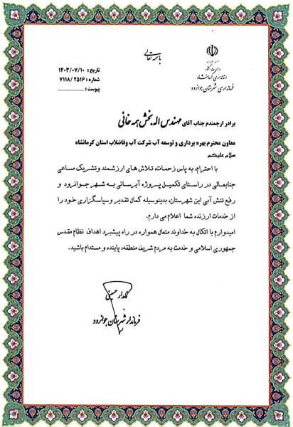 با احترام، به پاس زحمات، تلاش‌های ارزشمند و تشریک مساعی جنابعالی در راستای تکمیل پروژه آبرسانی به شهر جوانرود و رفع تنش آبی این شهرستان، بدینوسیله کمال تقدیر و سپاسگزاری خود را از خدمات ارزنده شما اعلام می‌دارم.