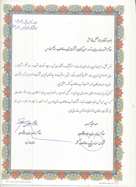 در بخشی از این لوح تقدیر آمده است: اکنون که مرحله اول این فرایند را تکمیل نموده ایم، بر خود واجب می دانیم از عملکرد و همکاری های مدبرانه و موثر جنابعالی که در این مسیر ضمن انجام وظایف مرتبط در شرکت آبفا فارس به نحو احسنت، در انجام امور محوله از سوی ستاد نیز مشارکت و همکاری موثر و شایسته داشته اید، قدردانی نماییم.