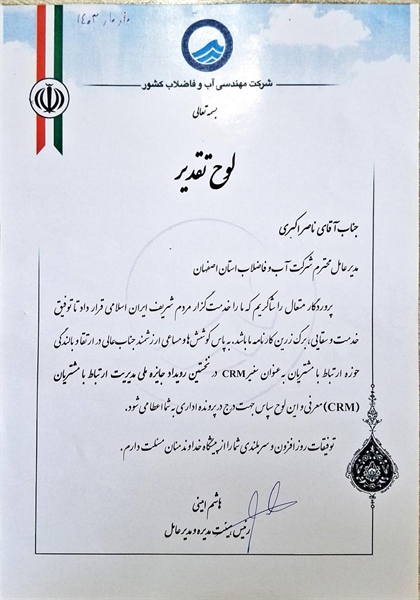 رویداد جایزه ملی مرکز ارتباط با مشتریان (CRM) صنعت آب و فاضلاب با حضور هاشم امینی، مدیر عامل و رئیس هیئت مدیره شرکت مهندسی آبفا کشور و مرتضی بخشایش، مدیر کل دفتر توسعه مدیریت و تحول اداری وزارت نیرو، در تالار آبگینه آبفای استان تهران برگزار و از شرکت آب و فاضلاب استان اصفهان به عنوان سفیر برتر این حوزه تقدیر شد.