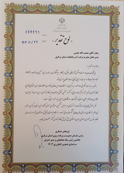 نوربخش عسگری رئیس سازمان مدیریت و برنامه ریزی استان مرکزی از حشمت اله عباسی مدیرعامل شرکت آب و فاضلاب استان مرکزی بواسطه تلاش های مجدانه و مشارکت ایشان در ششمین سرشماری عمومی کشاورزی استان با ارسال تقدیرنامه ای ، قدردانی نمود.