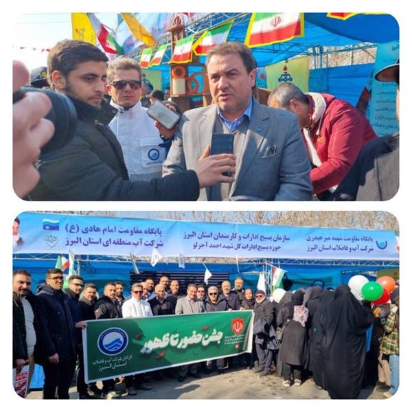 حمیدرضا نامداری در حاشیه این مراسم عنوان کرد: کارکنان خدمتگزار شرکت آب و فاضلاب استان البرز همگام با مردم شریف استان، ضمن شرکت در این اجتماع بزرگ ، اقدام به تشکیل غرفه فرهنگی در مسیر راهپیمایی نموده و سهم کوچکی در این جشن باشکوه ایفا نمودند.