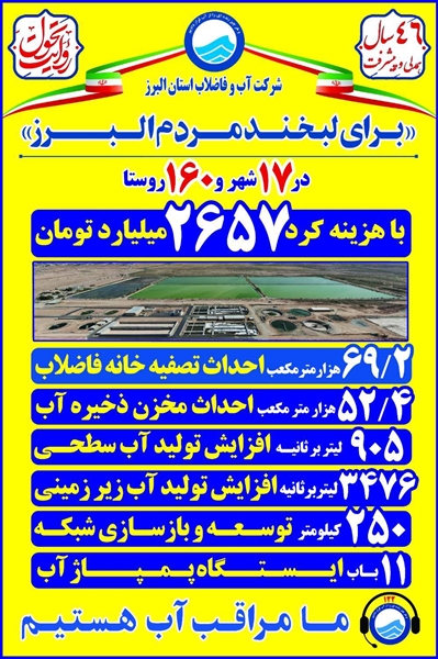 وی افزود: «پویش اطلاعرسانی "روایت تحول" بهمنظور تشریح اقدامات انجامشده، با اعتباری بالغ بر ۲۶۵۷ میلیارد تومان در ۱۷ شهر و ۱۶۰ روستای سطح استان البرز محقق شده و در این راستا، ۶۹ هزار و۲۰۰ مترمکعب به ظرفیت تصفیهخانههای فاضلاب استان البرز افزوده شده است. همچنین، احداث ۵۲ هزار و ۴۰۰ مترمکعب مخزن ذخیره آب نقش مهمی در تامین آب شرب پایدار و توزیع عادلانه منابع آبی ایفا خواهد کرد.