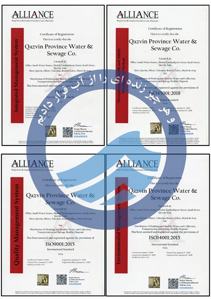 گواهینامه های ممیزی ثبت و صدور سیستم مدیریت یکپارچه (IMS) شامل سیستم های مدیریت کیفیت ISO9001-2015 و مدیریت زیست محیطی ISO 14001-2015 و مدیریت ایمنی و سلامت شغلی ISO 45001-2018 از سوی شرکت CB بین المللی، شرکت الاینس رجیسترا جهت شرکت آب و فاضلاب استان قزوین صادر شد.