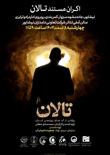 تالان مستندی است به کارگردانی محمد صادق دهقانی که با همکاری مشترک روابط عمومی و آموزش همگانی شرکت آب و فاضلاب ، جهادکشاورزی ،امور منابع آب ، محیط زیست و شرکت تعاونی دامداران نیشابور برای کشاورزان و دانش آموزان این شهرستان با حضور مسئولان و جمعی از فعالان محیط زیست و ناجیان آب اکران شد.