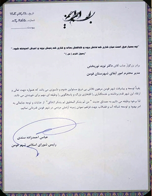 در بخشی از لوح تقدیر شورای شهر خطاب به نوید نوربخش آمده است: «بر خود وظیفه میدانیم به پاس پیگیریهای مستمر و بهبود شبکه آب و فاضلاب شهر فومن، که آرامش و آسایش شهروندان را به همراه داشته، از تلاشهای شما سپاسگزاری کنیم.»