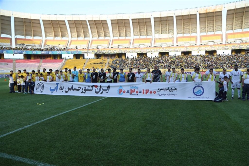 همچنین بازیکنان دو تیم با در دست داشتن بنری مزین به شعار «ایران، کشور حساس به آب» که نشان دهنده لزوم حفظ و مراقبت از این مايع حیاتی است مسابقه خود را آغاز کردند.