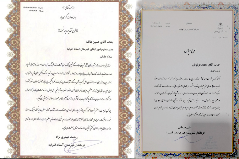 بنابراین گزارش؛ طی احکام جداگانه ای، حسن امیدوار مدیر امور آبفای انزلی و همچنین سید حسین موسوی همکار حوزۀ بهره برداری این شهرستان با دریافت لوحی از محمد صالح ضیایی فرماندار شهرستان بندر انزلی به جهت خدمت رسانی به مردم شریف شهرستان مورد تقدیر قرار گرفتند؛ همچنین با اهداء لوح از سوی علی درمانی فرماندار شهرستان مرزی بندر آستارا، محمد غزنویان بعنوان مدیر نمونه شهرستان انتخاب و مورد تقدیر واقع شد؛ حسین هاتف مدیر امور آبفای شهرستان آستانه اشرفیه نیز با دریافت لوحی از سوی رحمت حیدری نژاد فرماندار این شهرستان مورد تقدیر قرار گرفت؛ در نهایت شایان ذکر است؛ نوید نوربخش مدیر امور آبفای شهرستان فومن به عنوان مدیر نمونه از سوی اسماعیل قاسمی فرماندار شهرستان فومن شایسه تقدیر شد.